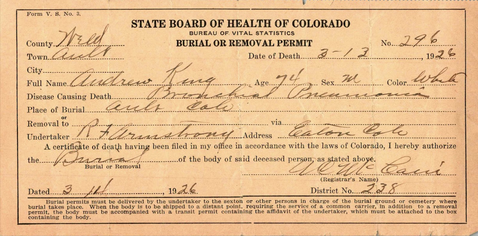 After months of sifting through different online record collections and coming up empty, I thought to reach out to Ault Cemetery, the same cemetery in which Andrew’s sisterJeanette is buried. I noticed that the cemetery clerk issued acall for genealogical informationso I reached out to see what they knew. And eureka! They had a burial record for Andrew with a date of death: 13 March 1926.