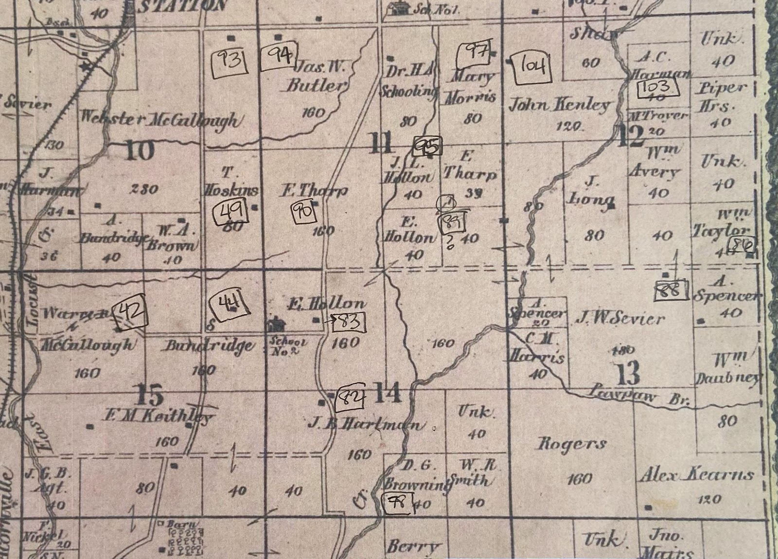 Fortunately, the Edwards Brothers of Missouri published a plat book in 1877 so there is only a seven year gap between the two records. A lot can happen in a seven year span, but it’s much better than decades apart. My thought process is that property didn’t change ownership frequently at this time and tended to stay in the family. So I’m fairly confident that the residents didn’t change dramatically between 1870 to 1877.