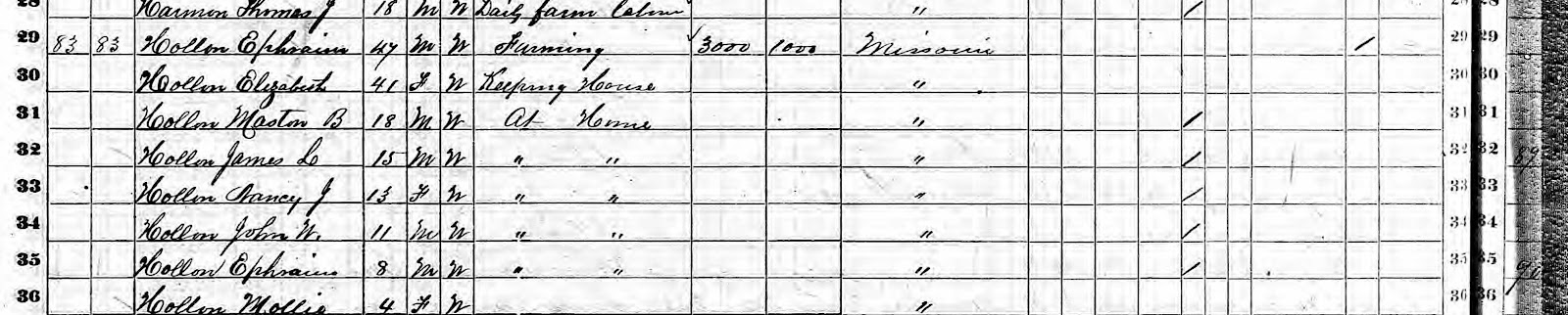 Source: “1870 U.S. Federal Census,” Missouri > Sullivan > Pleasant Hill, image 12, household of Ephriam Hollon, database with images, Ancestry (http://www.ancestry.com : accessed 2 June 2022); National Archives and Records Administration microfilm publication M593, page 267B, dwelling 83, Washington, D.C.