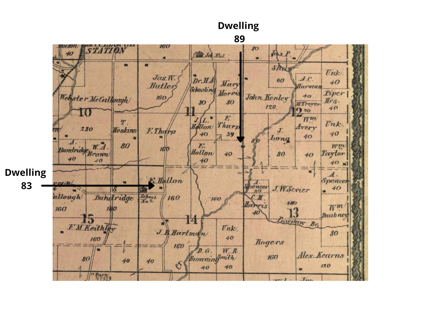 The exciting breakthrough came when I found the property of E. Hollon in sections 11 and 14 above. I believe this land owner is Ephriam Hollon, Amanda’s father. Ephriam’s real estate value is $3,000 so the census record corroborates the plat map evidence. The Hollon family was enumerated just a few dwellings away from Peter and Amanda - 83 and 89, respectively.